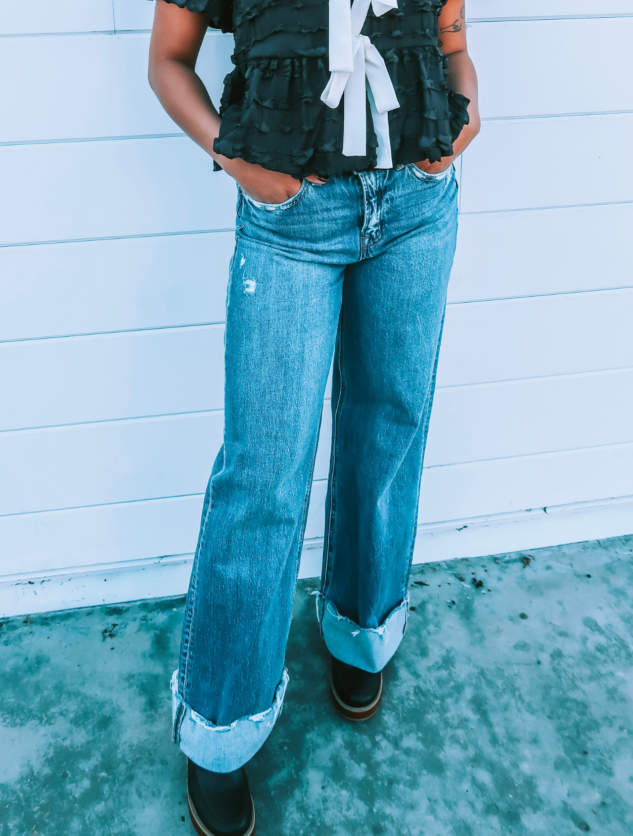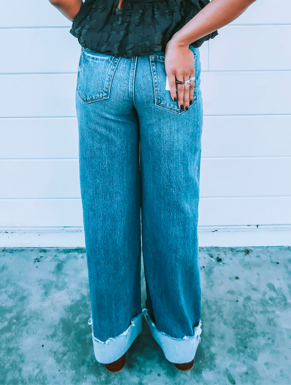 Embrace laid-back style with a polished twist in our Medium Wash Super High Rise Cuffed Baggy Wide Leg Jeans. Designed with a flattering super high rise, these jeans cinch the waist for a timeless silhouette while the wide-leg cut and cuffed hem add a relaxed, vintage-inspired vibe. With a medium wash that’s endlessly versatile, these jeans pair effortlessly with everything from fitted tanks to cozy sweaters.
