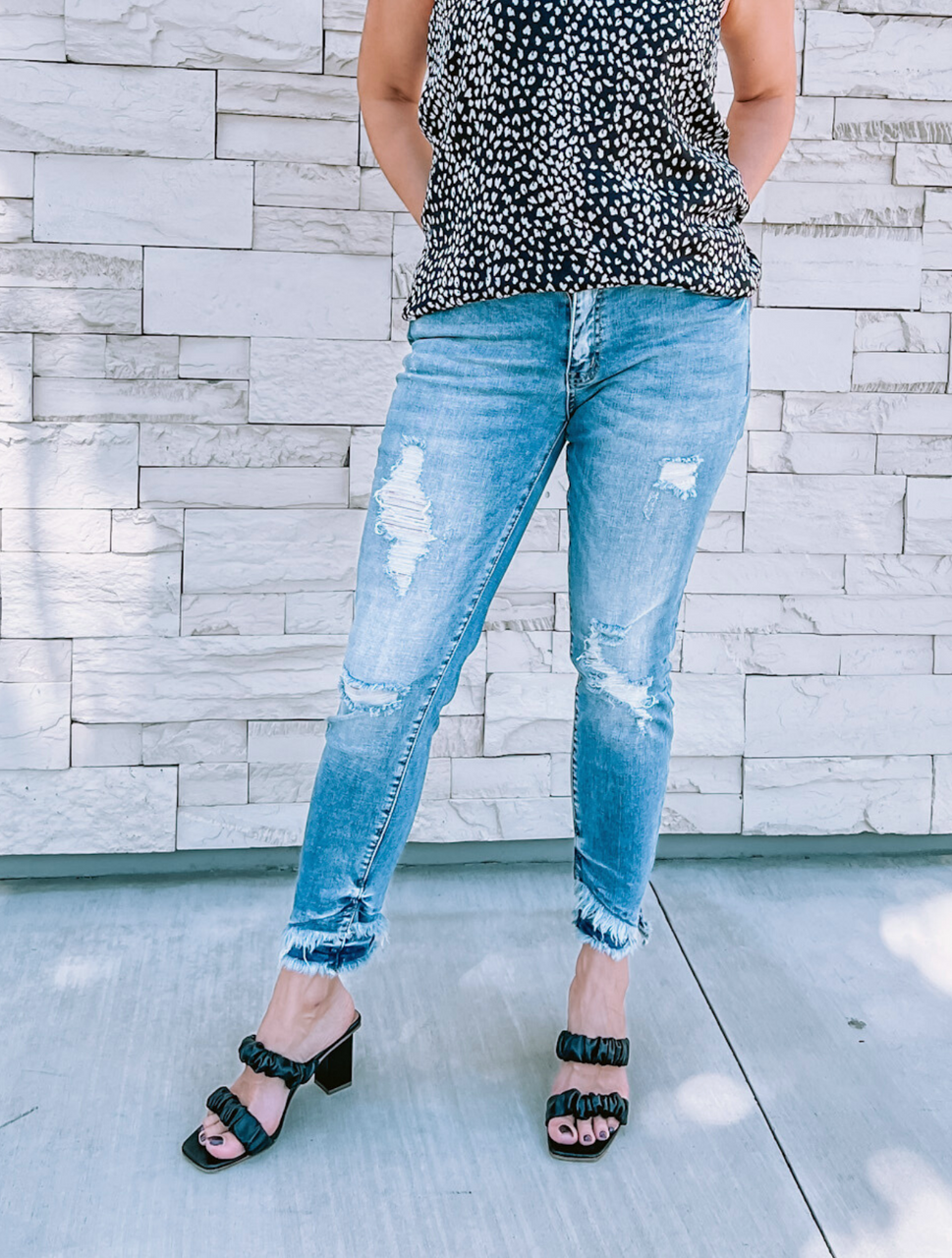Add an edgy twist to your everyday style with our Distressed Ankle Skinny Jeans. These form-fitting jeans feature a sleek skinny cut that hugs your curves while offering a flattering, streamlined look. The distressed detailing along the knees and frayed ankle hem adds a touch of attitude, making these jeans the perfect combination of cool and casual.