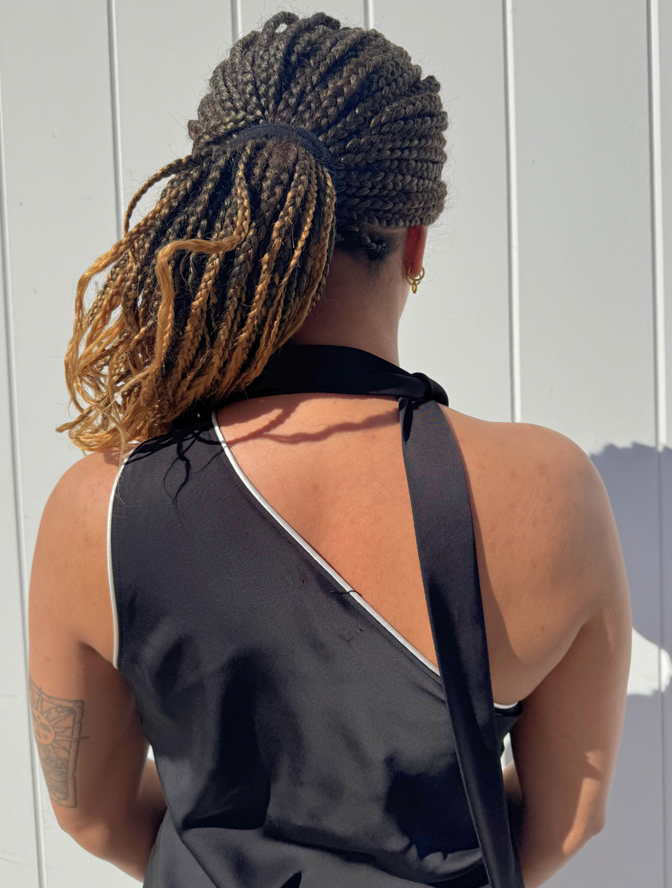 Elevate your evening look with the Bonnie Black Satin One Shoulder Scarf Dress, a stunning fusion of elegance and modern design. Crafted from luxurious satin, this dress drapes effortlessly for a sleek and sophisticated silhouette. The one-shoulder neckline adds a touch of allure, while the attached scarf detail flows gracefully for added drama. A delicate white contrast thin border outlines the dress, creating a striking visual accent that enhances its timeless appeal. Whether you're attending a formal event or a chic night out, the Bonnie Dress is the perfect statement piece for a refined and fashion-forward look.