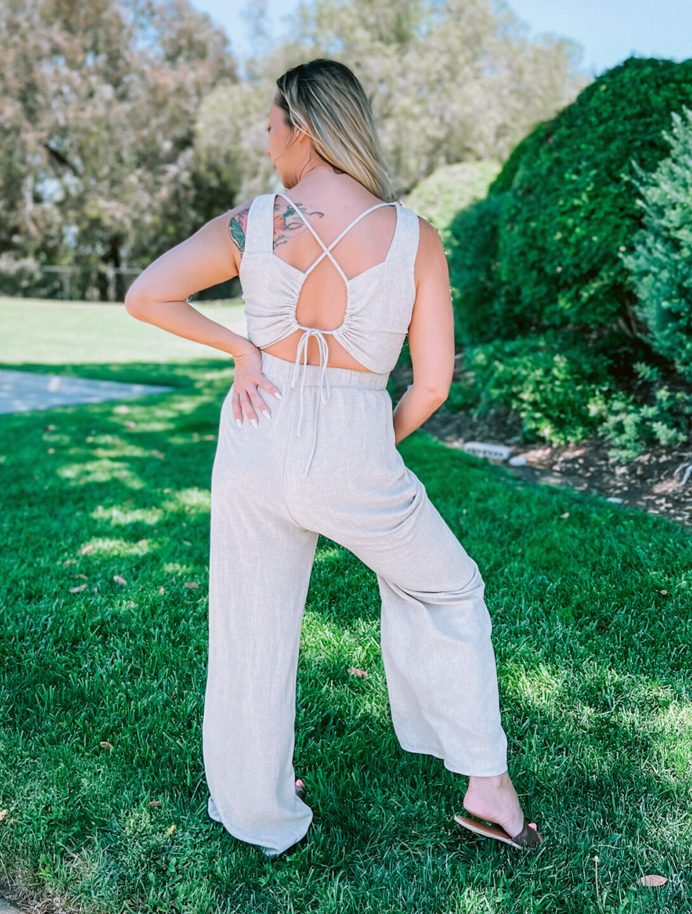 Oatmeal Criss-Cross Tie Back Elastic Waist Jumpsuit