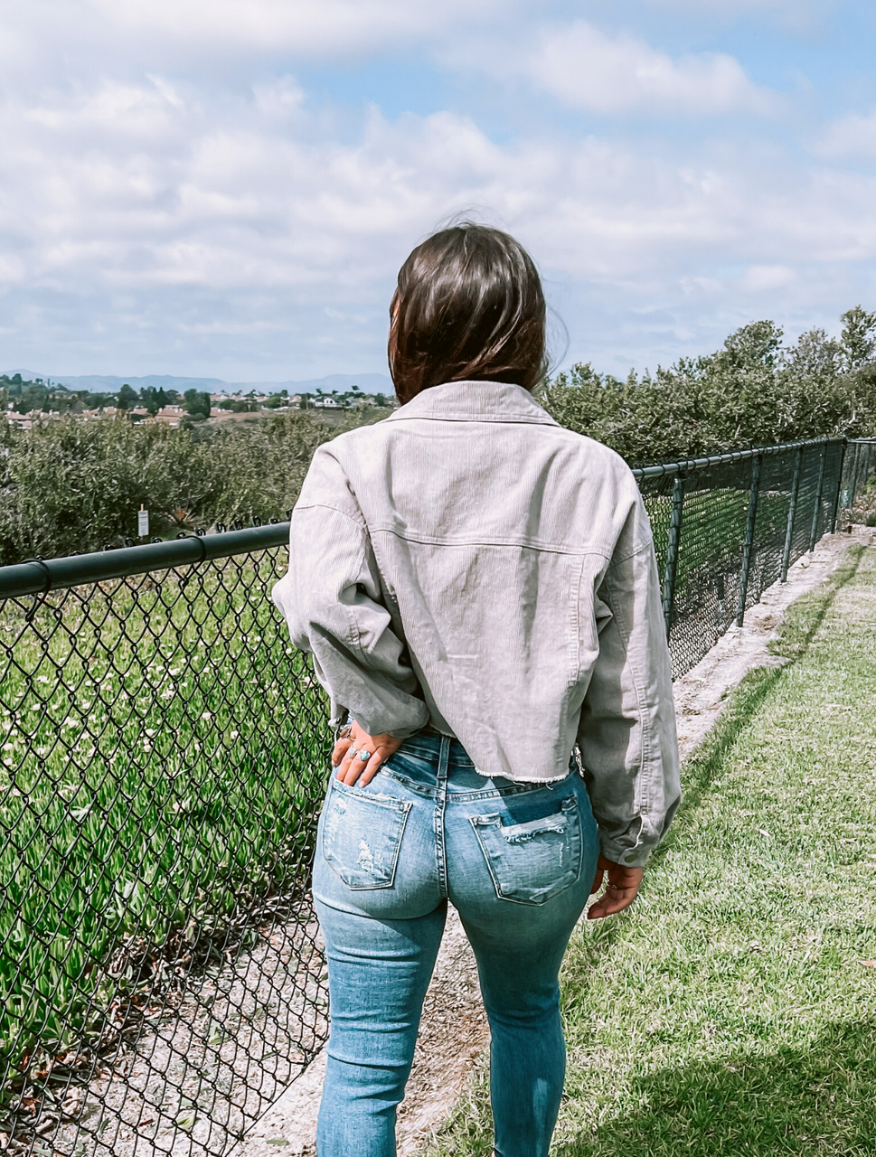 Add a touch of vintage flair to your wardrobe with the Stone Corduroy Cropped Jacket. This stylish piece features a cropped silhouette with frayed edges for an effortlessly cool vibe. Made from soft, textured corduroy in a neutral stone hue, this jacket is both comfortable and versatile, perfect for layering over your favorite outfits.