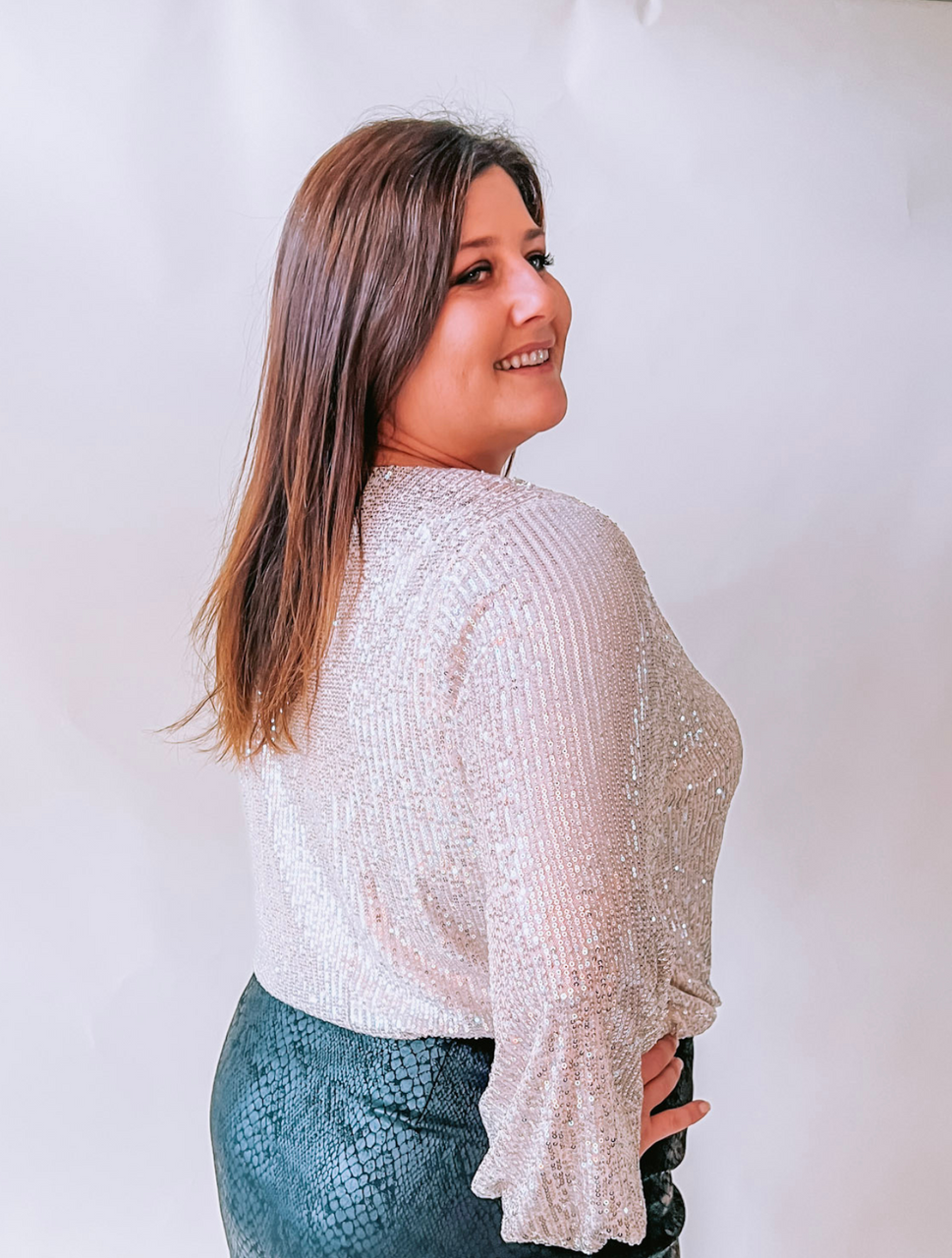 Turn heads and shine bright with the Plus Size Champagne Sequin Long-Sleeve Bodysuit. This dazzling bodysuit features shimmering champagne-colored sequins that catch the light, making it the ultimate statement piece for any special occasion. The flattering V-neckline and fitted design highlight your curves, while the long sleeves add a touch of elegance to this show-stopping look.