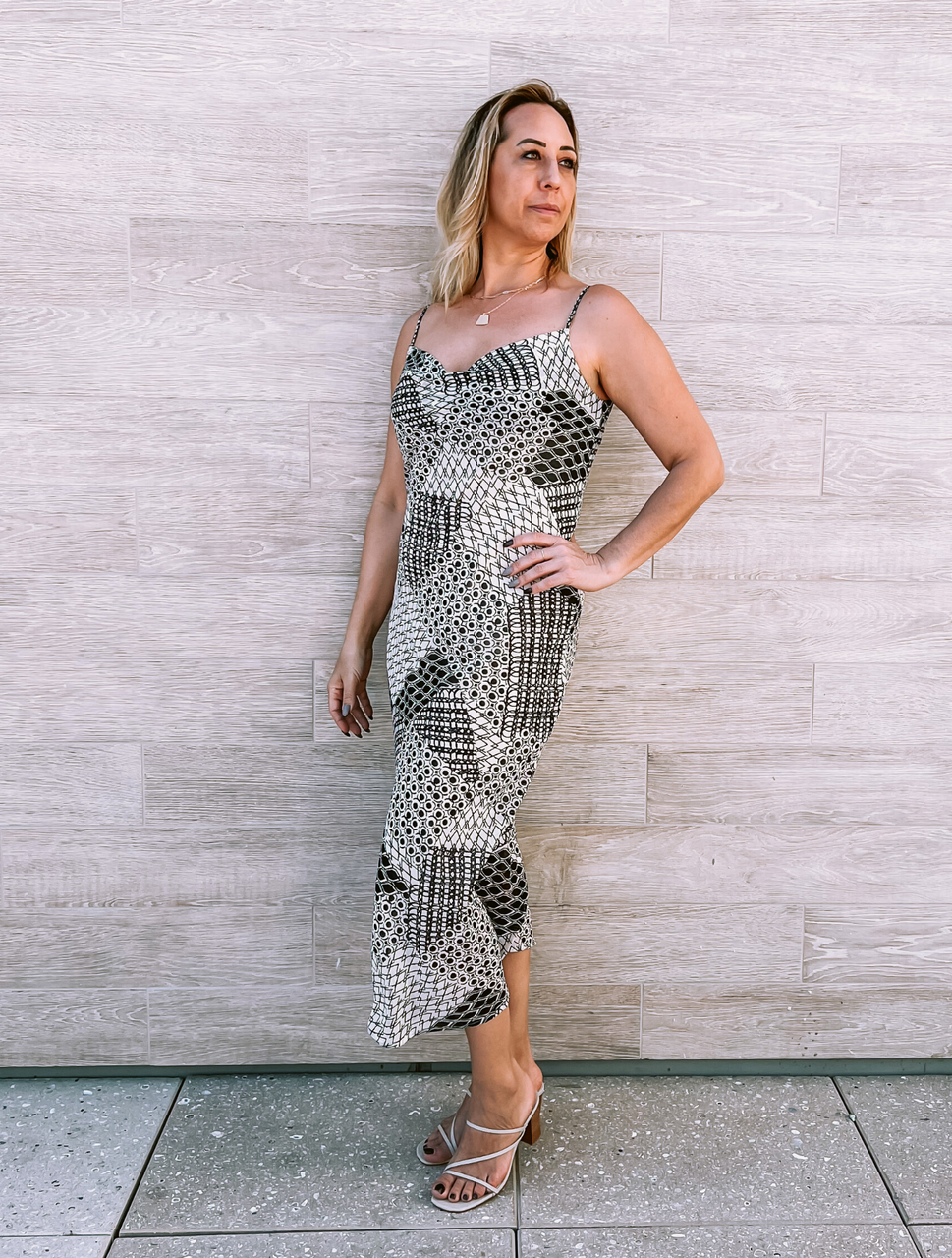 Crafted from silky, lightweight fabric, this dress offers a comfortable yet luxurious feel, making it perfect for both day and evening wear.
