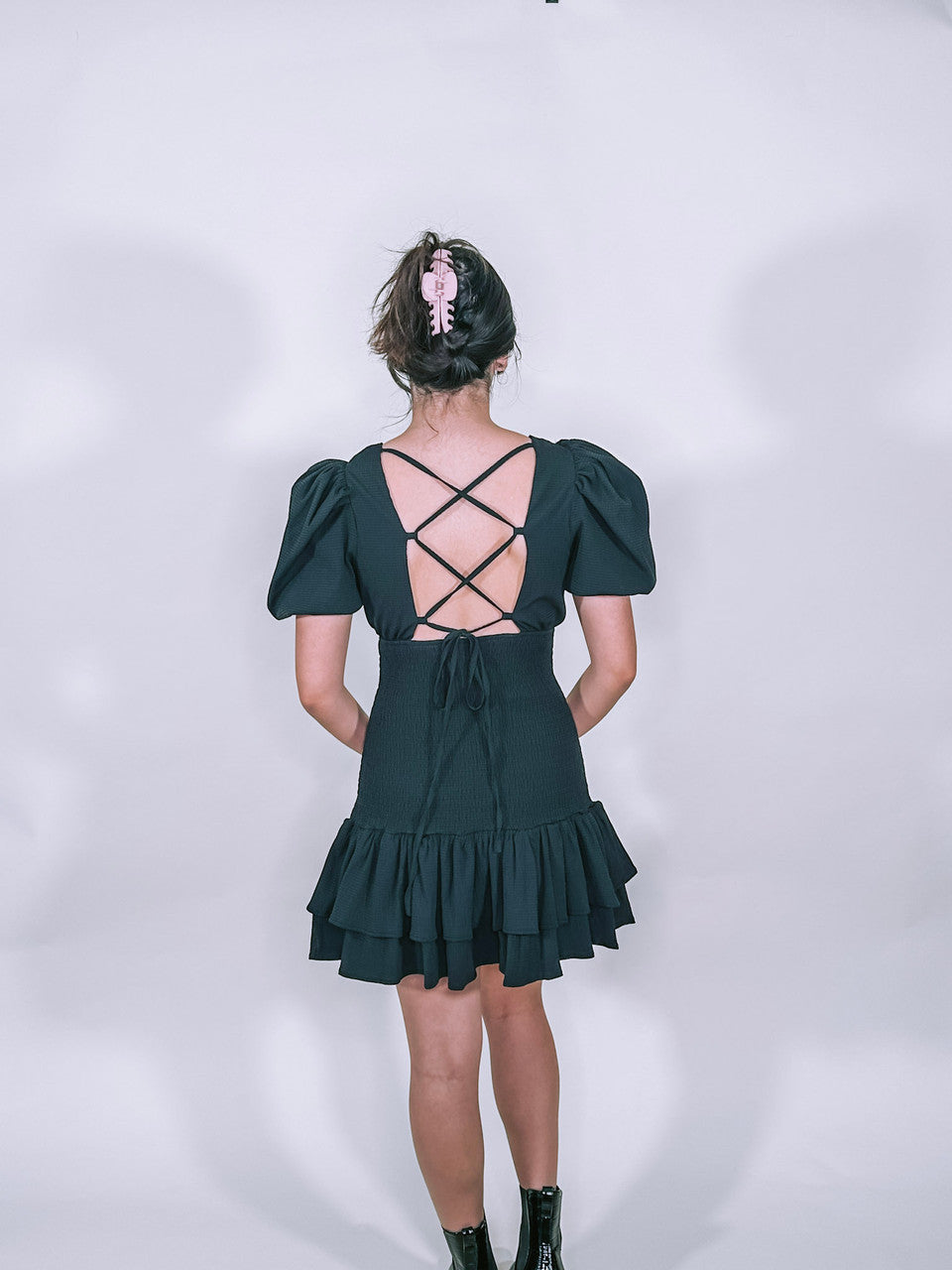 At the back, the lace-up detailing offers an adjustable fit, ensuring both comfort and style while giving a delicate yet bold touch to your look. The flirty mini length and flowy skirt create a balance of sophistication and fun.