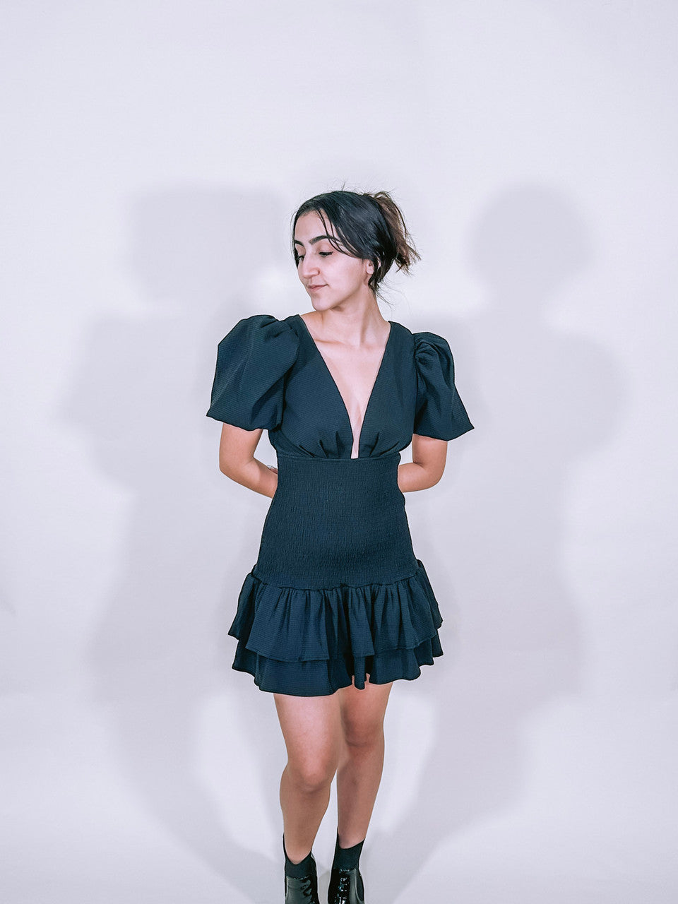 Embrace elegance and a hint of drama in this Black Smocked Bodice Mini Dress. The smocked bodice ensures a flattering, fitted shape, while the playful puffy sleeves add a touch of romantic charm. The dress features a sultry plunging neckline that adds allure, perfect for an evening out or a special occasion.