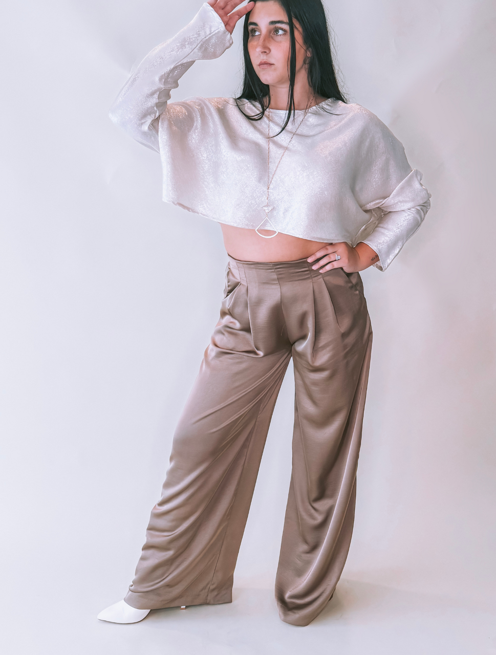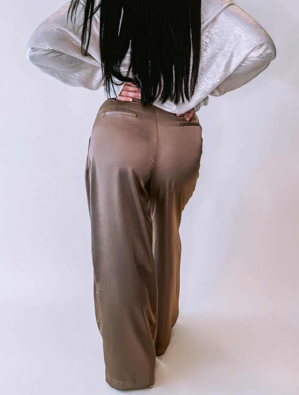 Step up your style game with our Mocha Pleated High-Waisted Wide Pant – the perfect blend of comfort and sophistication. Designed to flatter every body type, these pants feature a high-waisted fit that accentuates your waistline, while the elegant pleats and satin feel to add a touch of timeless class. The wide-leg silhouette offers unparalleled comfort and freedom of movement, making them ideal for both professional settings and casual outings. Elevate your wardrobe with this versatile staple that pairs effortlessly with any top or accessory. Redefine chic!